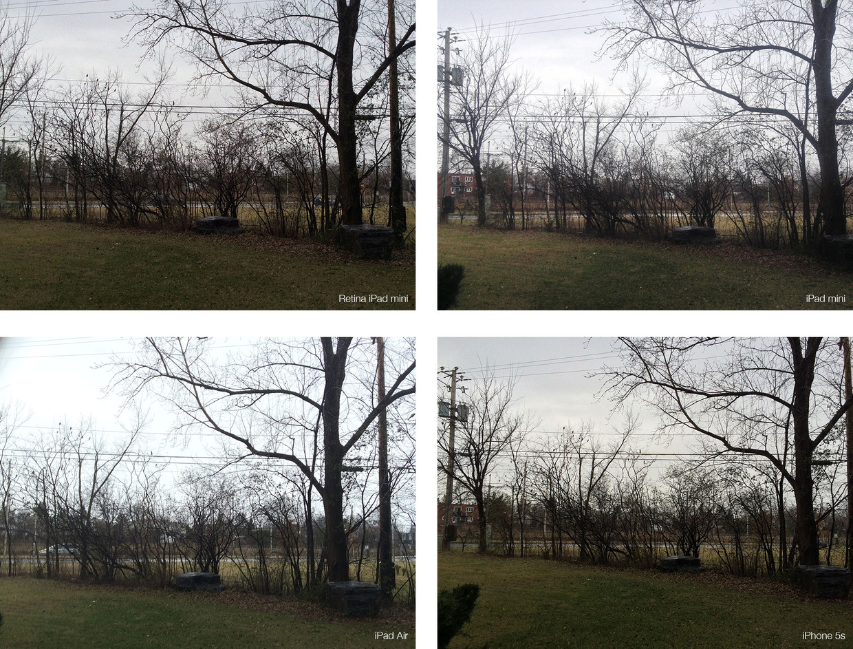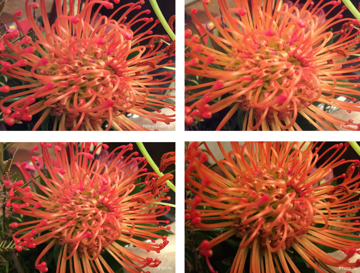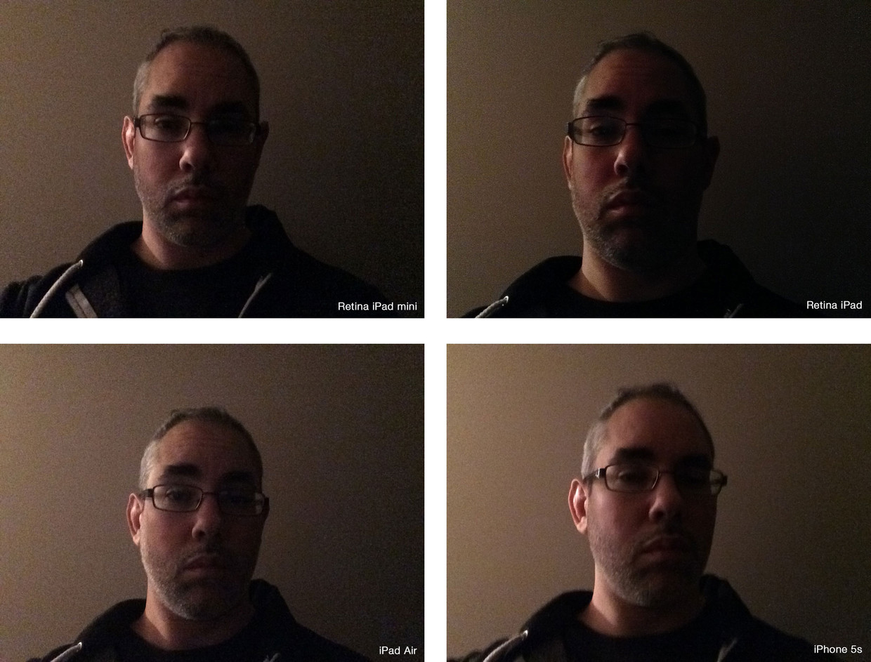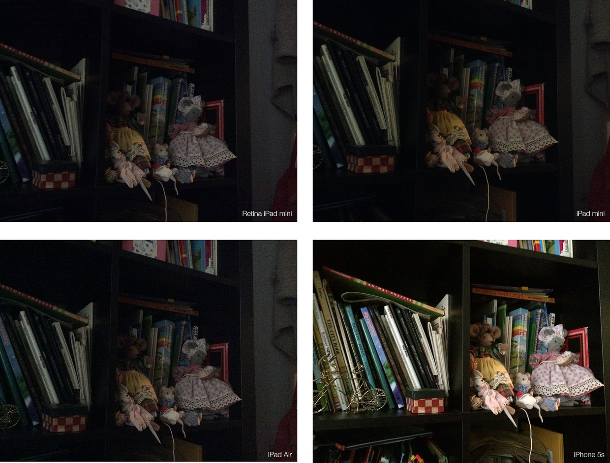 iPad mini (první generace) jako jediný nedisponuje funkcí HDR. Všechny iPady následně mají 5Mpix čip a clonu f/2,4. iPhone 5S má k dispozici 8Mpix čip, clonu f/2,2 a navíc duální blesk.