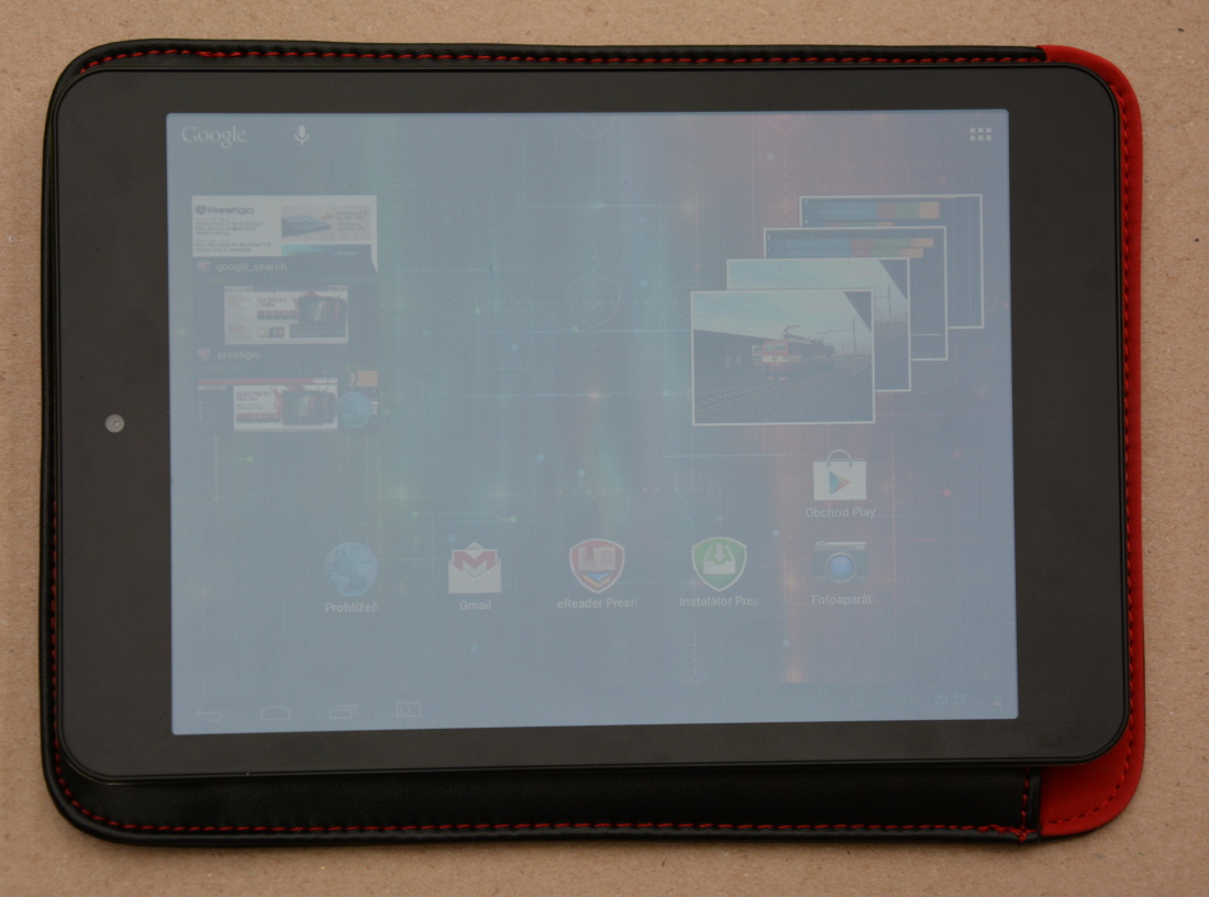 Za nedostačující hodnotíme pohled nejen na přímém slunci, ale prakticky kdekoliv venku mimo stín. Nezaujme vás ani rozlišení displeje 1 024 x 768 pixelů. Problémem není najít ani viditelný rastr. Na cenovou kategorii tabletu je displej dobrý a je jasné, že nemůžeme očekávat retina displej, ale aspoň povrchová úprava by neuškodila a rozhodně bych za ní hned vyměnil pouzdro i s USB redukcí. Prestigio tak mohlo své peníze investovat lépe.