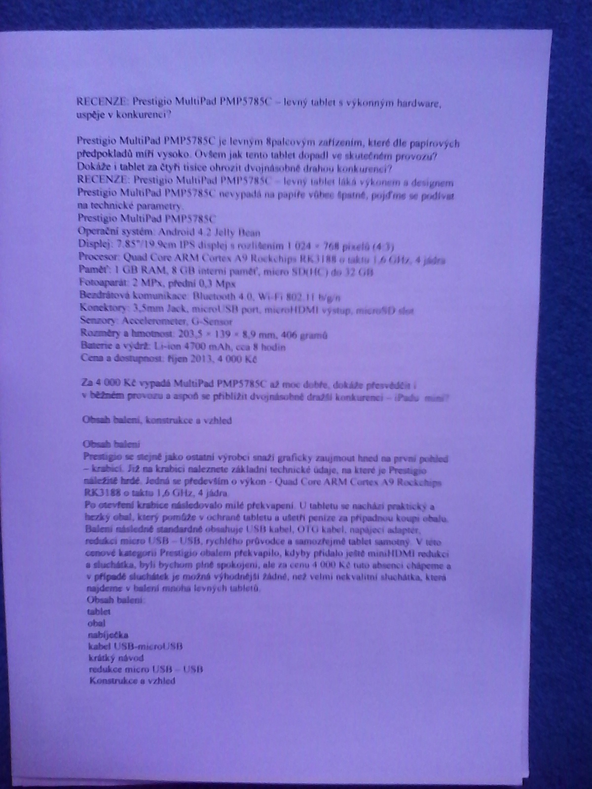 Jak se můžete přesvědčit, vyfocená A4 je v bídné kvalitě a špatně čitelná. Fotoaparát si vůbec neporadí se světlem, obloha je často vypálená a to i v případě, kdy fotíte se sluncem v zádech. Tento problém ostatně neplatí jenom o obloze. Tam, kde si téměř všechny fotoaparáty poradí, MultiPad PMP5785C ne. Zde Prestigio velmi zklamalo, i když je jasné, že kvůli fotoaparátu si tento přístroj nekupujete.