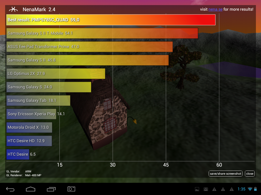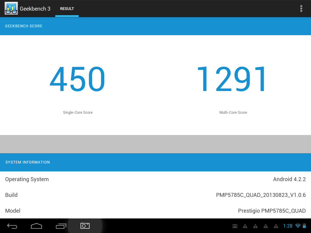 Výkon jsme podrobili hned čtyřem benchmarkům, které pečlivě otestují celkový výkon Prestigio. Začali jsme s Geekbench. Ten nám ukázal úctyhodných 1 291 (450 na jádro). Další na řadu přišel AnTuTu benchmark. Zde jsme těsně porazili Samsung Galaxy S3 a i námi testovaný Asus MeMO Pad FHD 10, který samozřejmě nabídne jiné přednosti. V NenaMarku, který testuje grafiku s vyššími nároky a rozlišením, jsme dosáhli 59 bodů. To znamená, že tablet zvládne zobrazit 59 snímků za sekundu (FPS). Jako poslední jsme zvolili Quadrant Standart Edition. Zde MultiPad PMP5785C obdržel 5 001 bodů a porazil HTC One X či Asus Transformer Prime TF 201. Hned u druhého benchmarku jsme se radovali ze skvělého výsledku a z porážky vyspělejších zařízení. Je nezbytné na výsledky koukat objektivně. V poslední benchmarku Quadrant Standart Edition získalo Prestigio pouze 5 001 bodů, minulý týden recenzovaný Asus MeMO Pad FHD 10 zde byl o více než 1 000 bodů lepší.